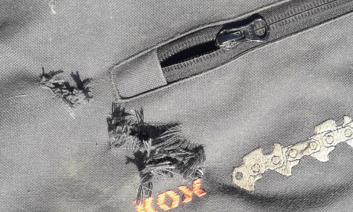 Nach einem Reinsägen muss die Hose immer ausgetauscht werden, da bei einem weiteren Schnitt die Schutzwirkung nicht mehr garantiert werden kann.
